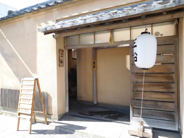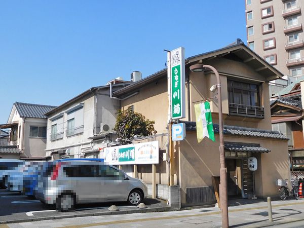 お店の脇に立つ緑の看板は、お向かいの鰻屋・川菊さんのもの。