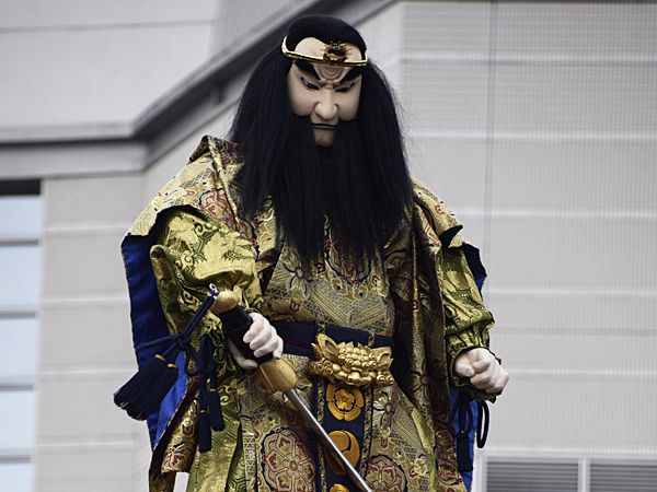 八木橋前歩道橋を越えるとすぐ、「山車」の地区は、いそいそと人形を上げはじめる。