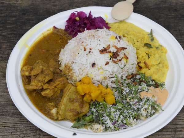 チキンカレーとレンズ豆のカレー盛り合わせ、彩りが綺麗で