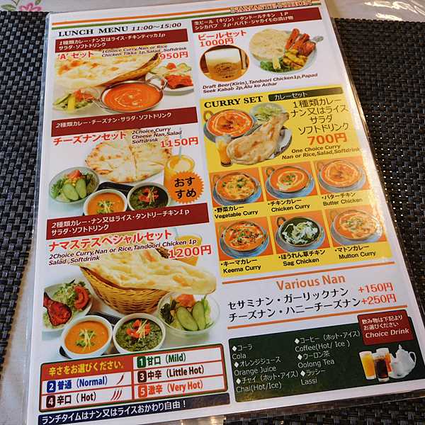 ランチメニューはこんな感じ、標準的なインドカレー屋さん。