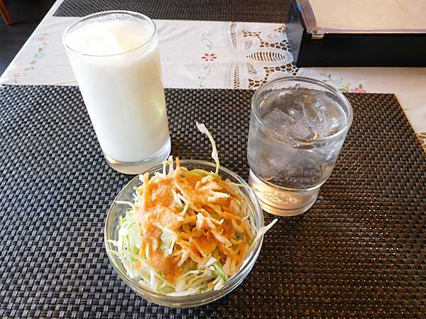 ということで、まずはサラダとドリンク(ラッシーにした)。