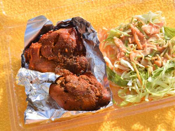 軽めにキャベツサラダが添えられた、大きめの タンドリーチキン