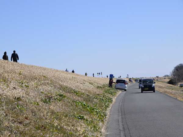 すぐに、路肩に駐車する車や、土手上を歩く人達がたくさん。