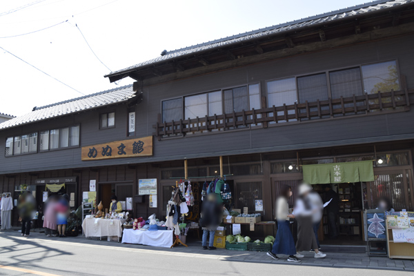 商品を前に出したりしている、 会場東端方面「お休み処めぬま館」の建物。