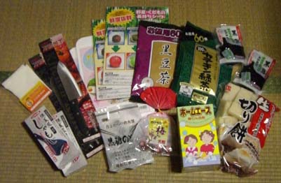 お餅・緑茶・豆茶・洗剤・飴・カリカリ梅。 それから、煮豆・包丁・しゃもじ・簡易まな板・