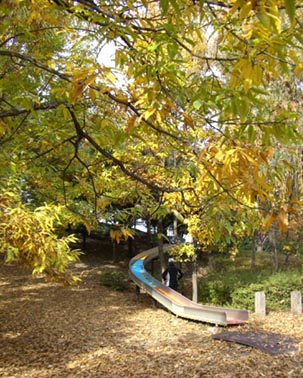 散歩道も、子供用の遊具も、赤や黄色の木々・茶色の落ち葉に囲まれてステキよ。