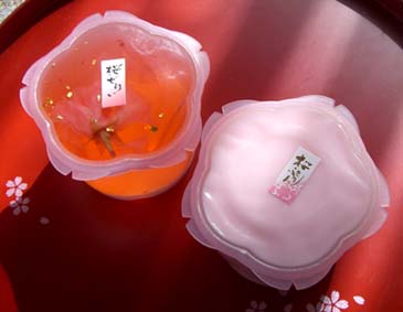 ゼリーは 透き通ったピンク色の中に塩漬けの桜花が一輪入って、金箔まで散らしてあって 綺麗!