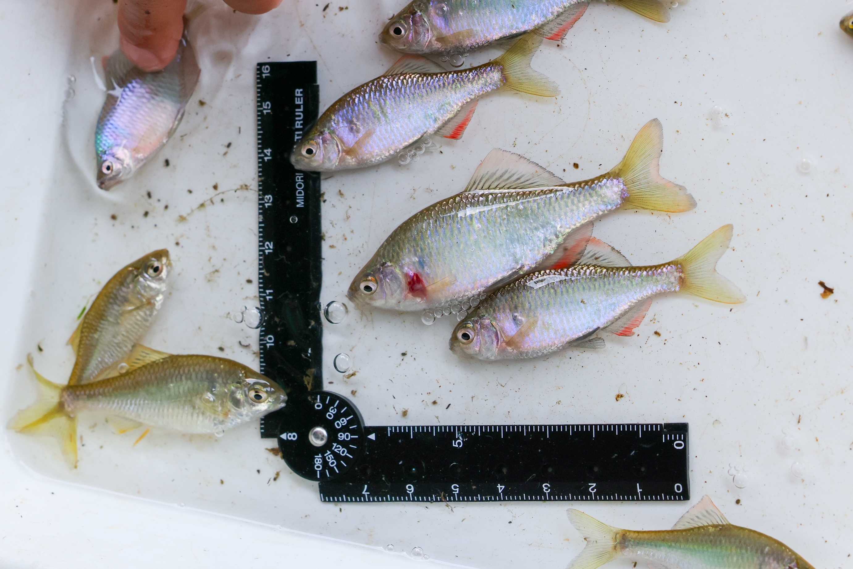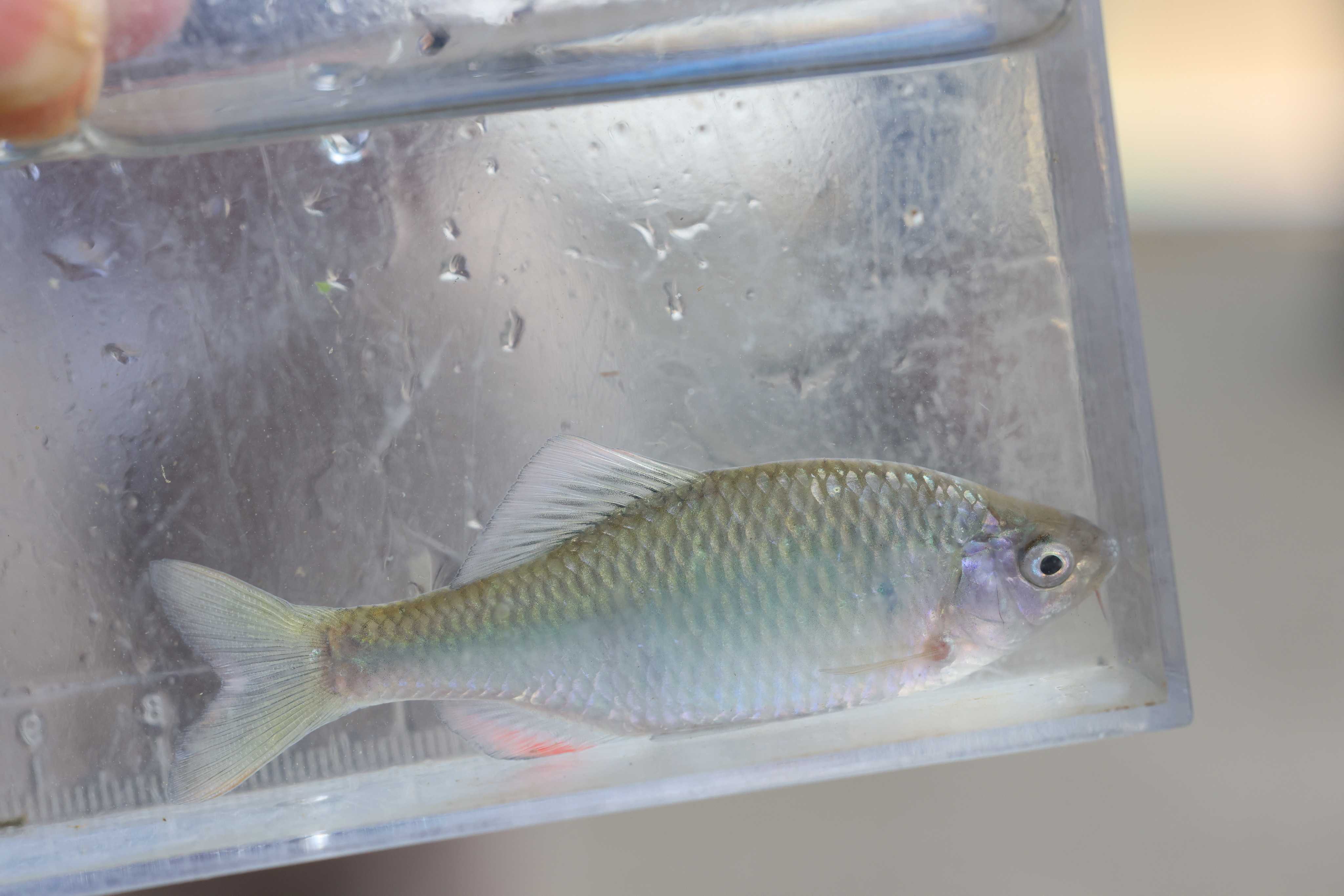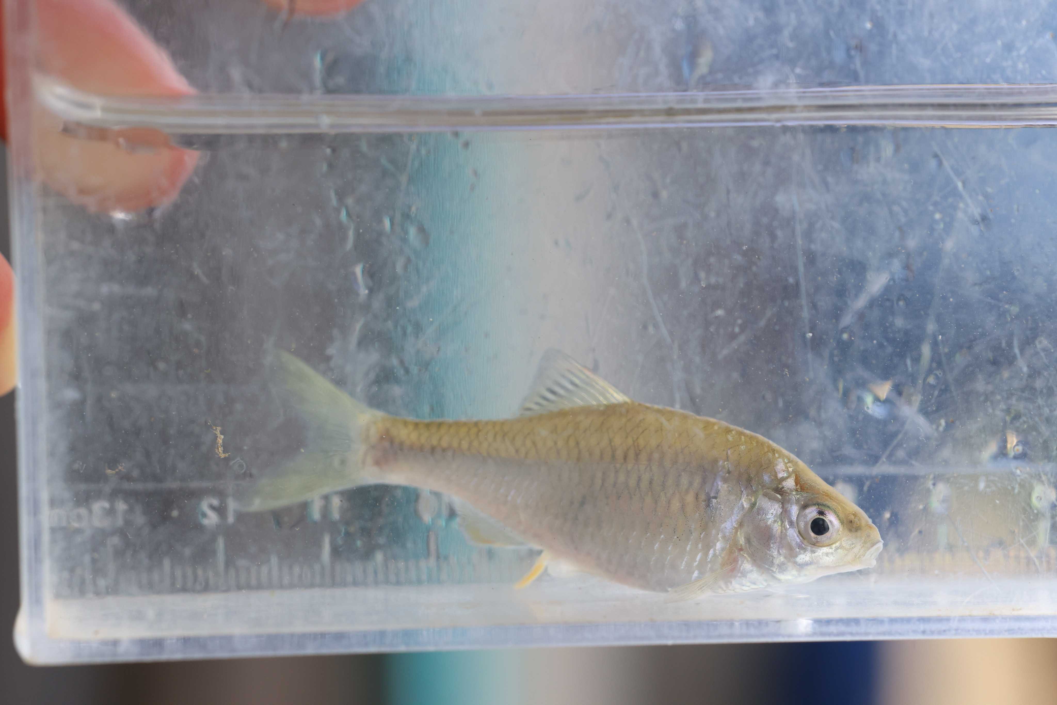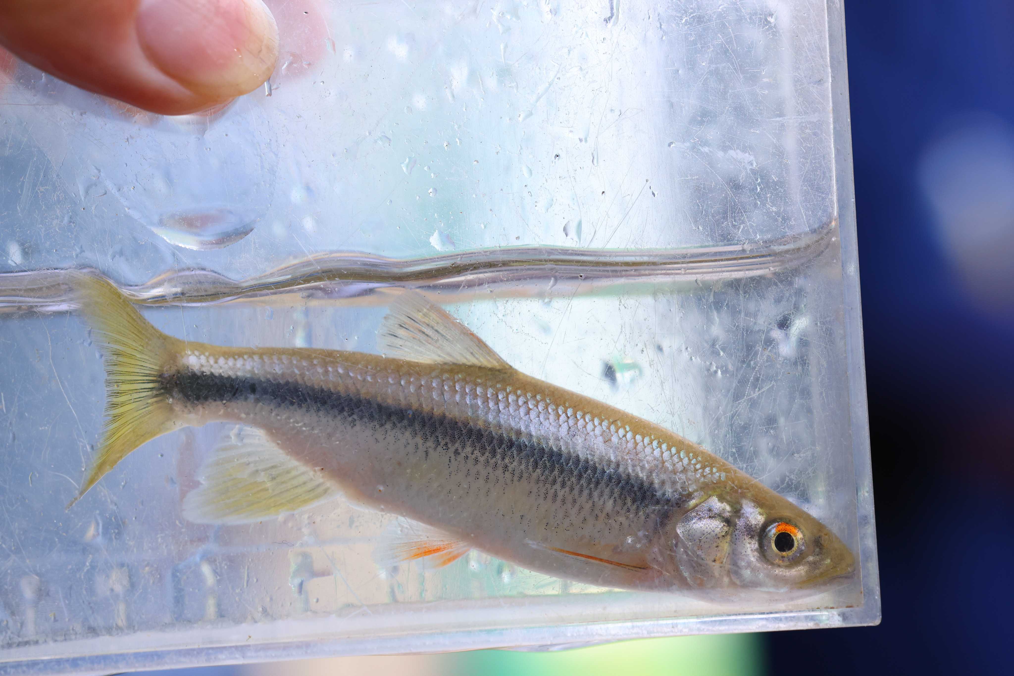 五十鈴川水系の用水路で、透明度はとても良く、上からでも泳いでいる魚(ヌマムツ、ヤリタナゴ、カマツカ)が確認できるほどでした。護岸も石組みで、環境もとても良かったです。タナゴ類も多くみられ、繁殖に必要な貝(マツカサガイ)もしっかり確認できました。小学生の子供達には少し水深が深く、岸から採集してもらいましたが、少しはゲットできたかな?捕まえた生きものをみんな興味深げに観察していました。