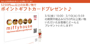 こんにちは宇戸です。暖かい季節とともにステキなTシャツが登場!ラインストーンで描かれたミッフィーもとってもかわいいスタイリッシュなデザイン♪今年の春夏はこれで決まり!★☆ ミッフィー Sweet label Tシャツ ☆★そして!3/20(金)10:00-3/23(月)9:59の期間中、新しいTシャツおよびmiffyhouseオリジナルパーカーやTシャツのいずれかをお買い上げで5250円(税込)以上お買い上げのお客様に500ポイント分のポイントギフトカードをプレゼント!--------------さらに!ケータイからのお買い物でポイント3倍!!(要エントリー)⇒ エントリー方法はこちらエントリー期間:3/19(木)AM10:00~3/23(月)AM9:59迄【ケータイ版 miffyhouse】⇒ http://m.rakuten.co.jp/miffyhouse/QRコードでケータイ版miffyhouseへ一発アクセス!