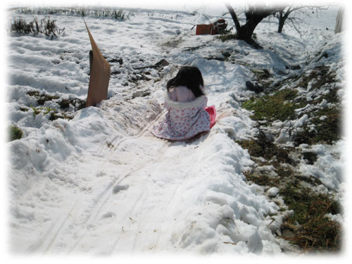 積りました~。 それほどの大雪ではないけれど。。。雪が積もって喜ぶのは子供だけだよね?(笑)昨日は、薄暗くなるまで外で遊んだme。軒下には、プリンカップで作った雪だるま(?)ここ、朝から日当たりいいから、すぐに溶けちゃうね・・・今日は、パパが何か作ってくれることでしょう「畑の坂道に、滑り台作ろうか?」なんて言ってたけれど。ソリあったかな?