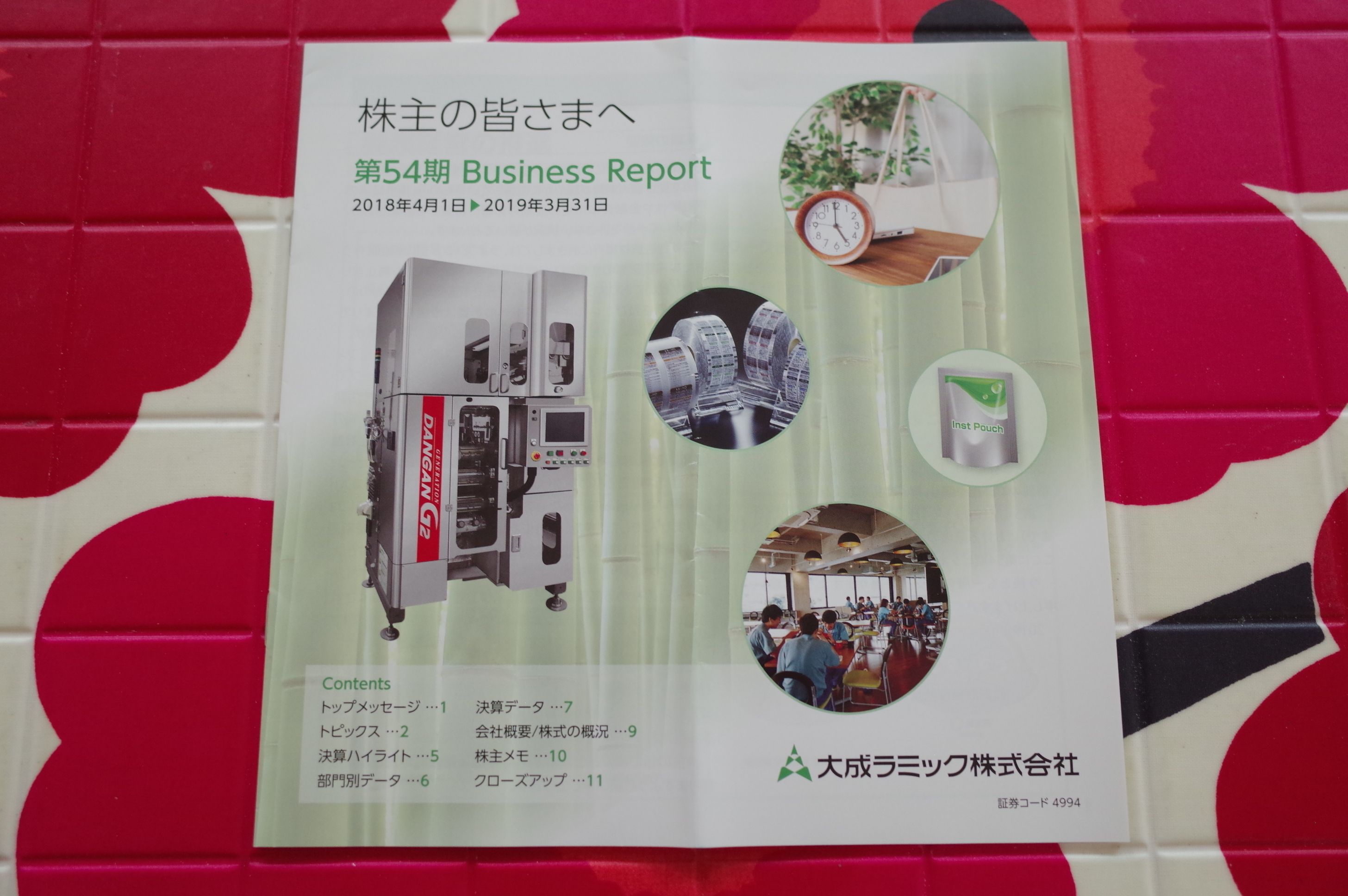 さて今日も2019ポートフォリオ概況シリーズです。 283位 4994 大成ラミック (東1、3月優待) ◎ PF283位は、包装用フィルム製造販売大手の大成ラミックです。 現在の株価は2719円、時価総額191億円、PBR0.95、自己資本比率は66.8%、今期予想PER16.23、配当利回り2.6%(70円)、総合利回り4.4%(70+50=120円)で、優待は「1年以上の継続保有」を条件として、100株保有で5000円相当の自社関連商品です。 ところで私が大成ラミックに参戦したのは、3971東セロという銘柄がきっかけでした。 東セロ(旧3971、東2)は包装用フィルム大手で、今は三井化学(4183、東1)に完全子会社化され市場から消えてしまいましたが、「自社フィルムを使用した様々な食品詰め合わせ」が優待で戴けて、毎回その内容が変わる、とっても嬉しく楽しい銘柄でした。 そして、東セロが突然に市場から消えてしまった後、私の心には深い残念さ・空しさ・寂しさが残りました。その心の空白を埋めるべく新規に参戦したのが、指標的には東セロよりも割高なものの優待内容が極めて似ている大成ラミックだったのです。 彼女と別れた後、何故かまたどこか面影が似た娘と付き合ってしまう ようなものかも知れないのですが(笑)、とにかく東セロ亡き後の私の心の空白を埋めてくれたのがここ大成ラミックだったのです。 すいません、話が大幅に脱線しました。それでは大成ラミックの優待品を具体的に見てみましょう。 毎回このように凄いボリュームなんですね。今日は1つだけ実際の使用例を御覧戴きましょう。 大成ラミック優待のなめ茸入り酢の物 大成ラミックは指標的には妥当な株価位置ですが、優待内容は上記の通り極めて魅力的です。また総合利回りも4%を超えていますし、今の市場環境の中では優待族的にはまずまず魅力的だなと思っています。これからも優待改悪や廃止が無い限りはホールドして応援していく予定です。