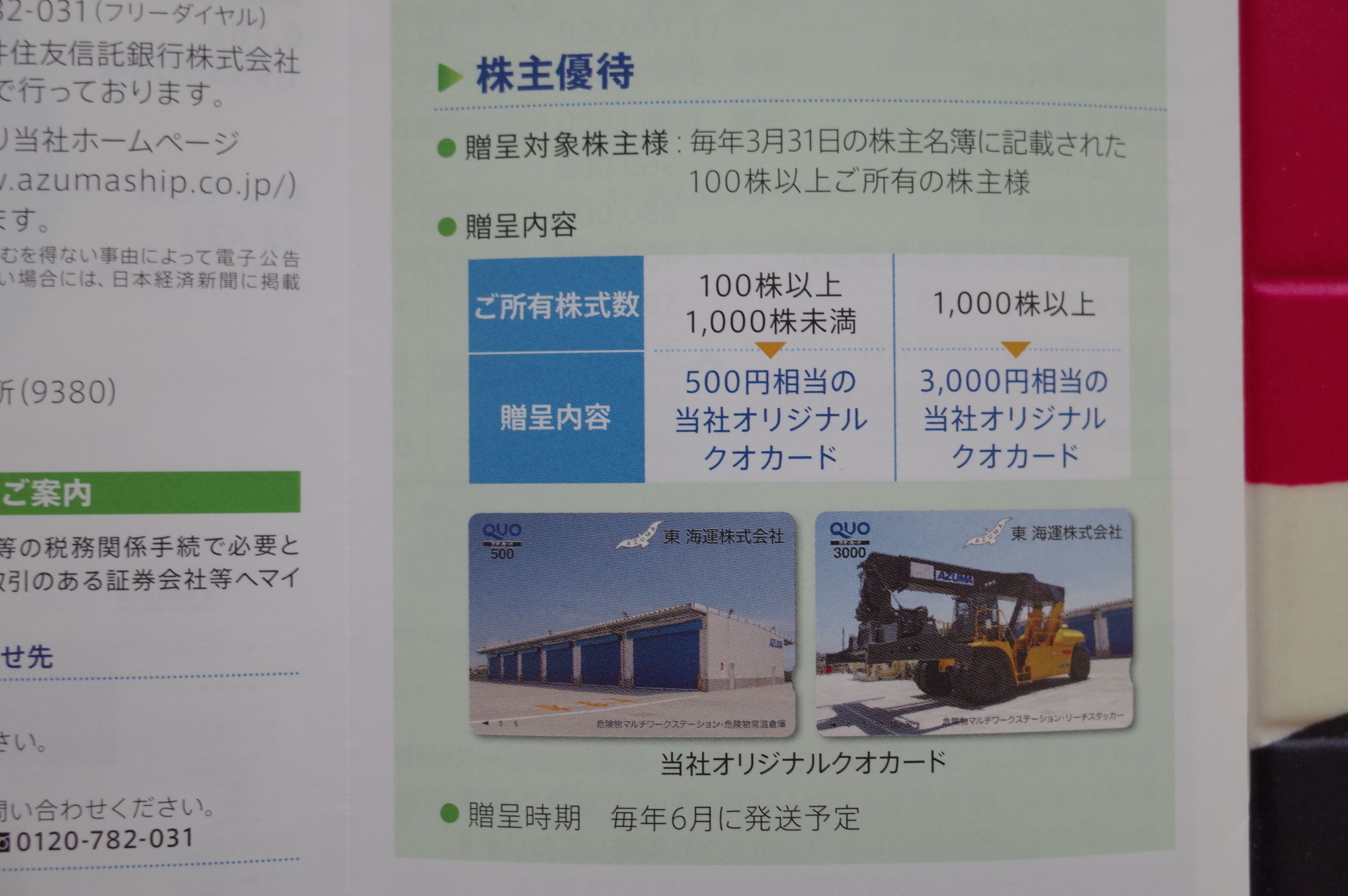 東海運は指標的には妥当な株価位置ですが、3万円程度の比較的小額の投資で現金系優待が戴けるというのは大きな魅力です。少ない資金で他にクオカード優待が戴ける銘柄としては、2300きょくとう などがありますが、この手の銘柄を「広く薄く持つ」ことは、