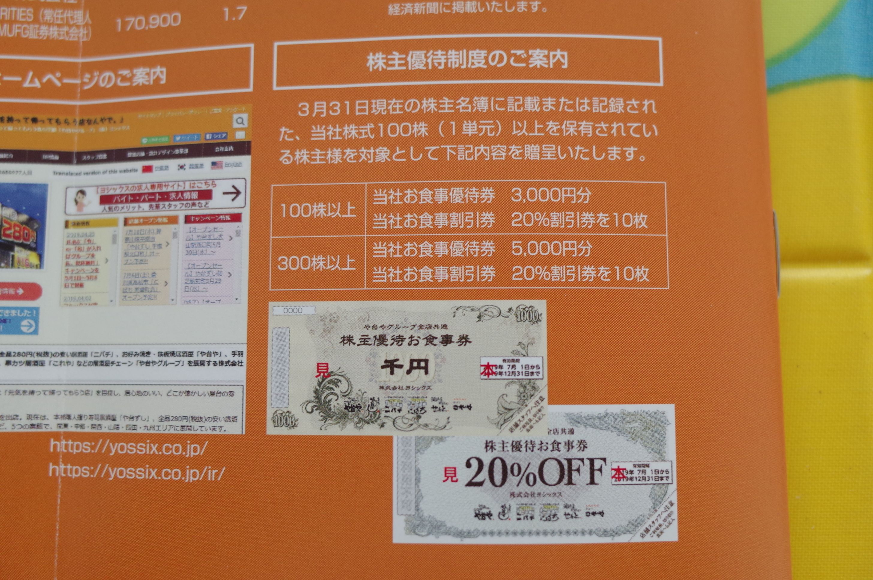 現在の株価は3045円、時価総額314億円、PBR4.64、自己資本比率は63.7%、今期予想PER19.76、配当利回り0.8%(24~30円)、総合利回り2.6%(24+60=84円、食事券+割引券でヤフオク平均落札価格は額面の90~100%。なのでここでは100%で換算。)で、優待は年2回100株保有で3000円相当の食事券+20%割引食事券10枚です。​