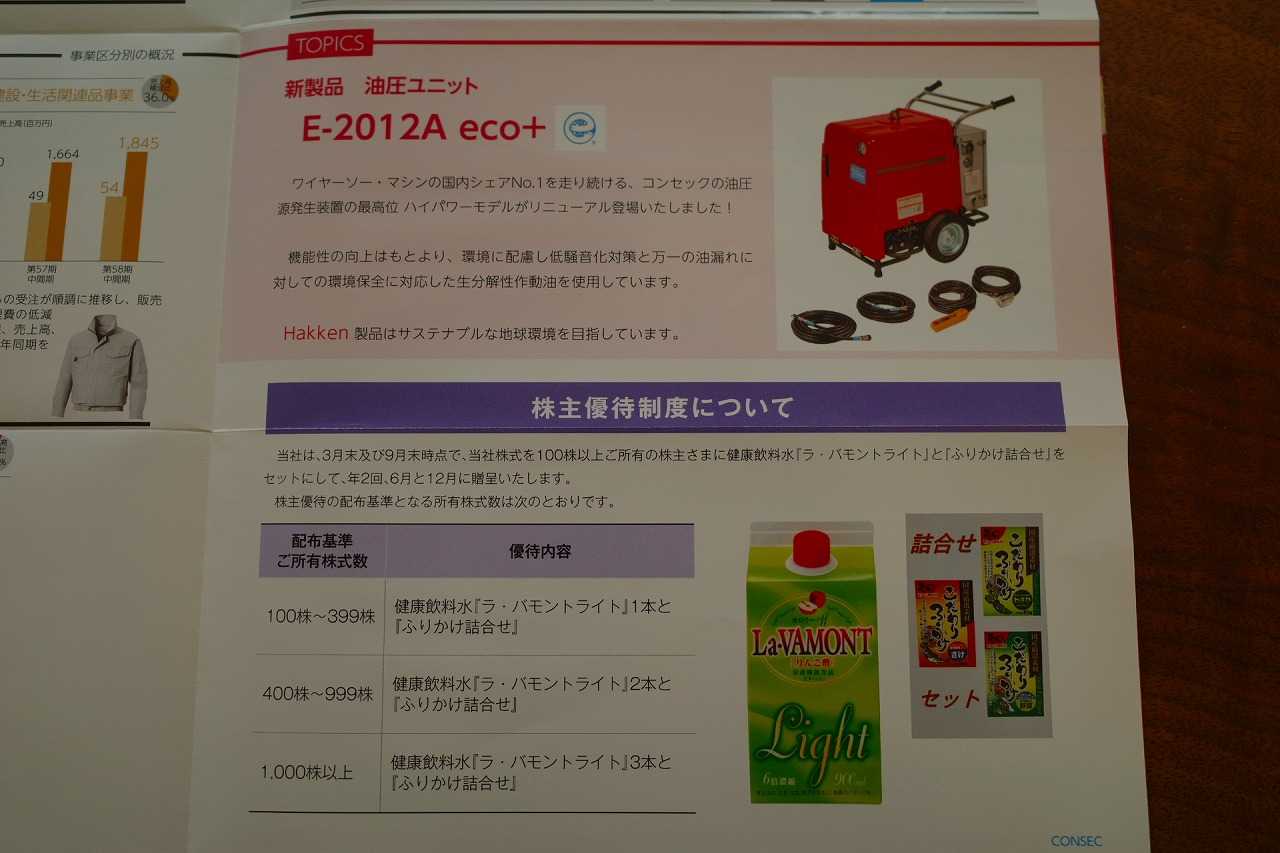 現在の株価は1309円、PBR0.29、自己資本比率は66.3%、今期予想PER13.55、配当利回り2.1%(27円)、総合利回り4.4%(27+30=57円、優待品はメルカリ平均価格の1セット1500円で換算)で、優待は100株保有で年2回、 「健康飲料水 ラ・バモントライト」1本+1000円相当のふりかけ詰合わせなどです。