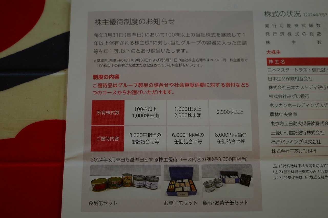 さてそんなアンビバレントなホッカンHDの現在の株価は2148円、時価総額289億円、PBR0.46、自己資本比率43.0%、今期予想PER8.26、配当利回り4.3%(93円)、総合利回り5.2%(93+18=111円、優待品はメルカリ平均価格の額面の60%で換算)で、 優待は「 100株保有で3000円相当、1000株保有で6000円相当、2000株保有で8000円相当の自社グループ商品詰め合わせです。しばらく前から缶詰以外にお菓子やバラエティセットも選択できるようになりました。