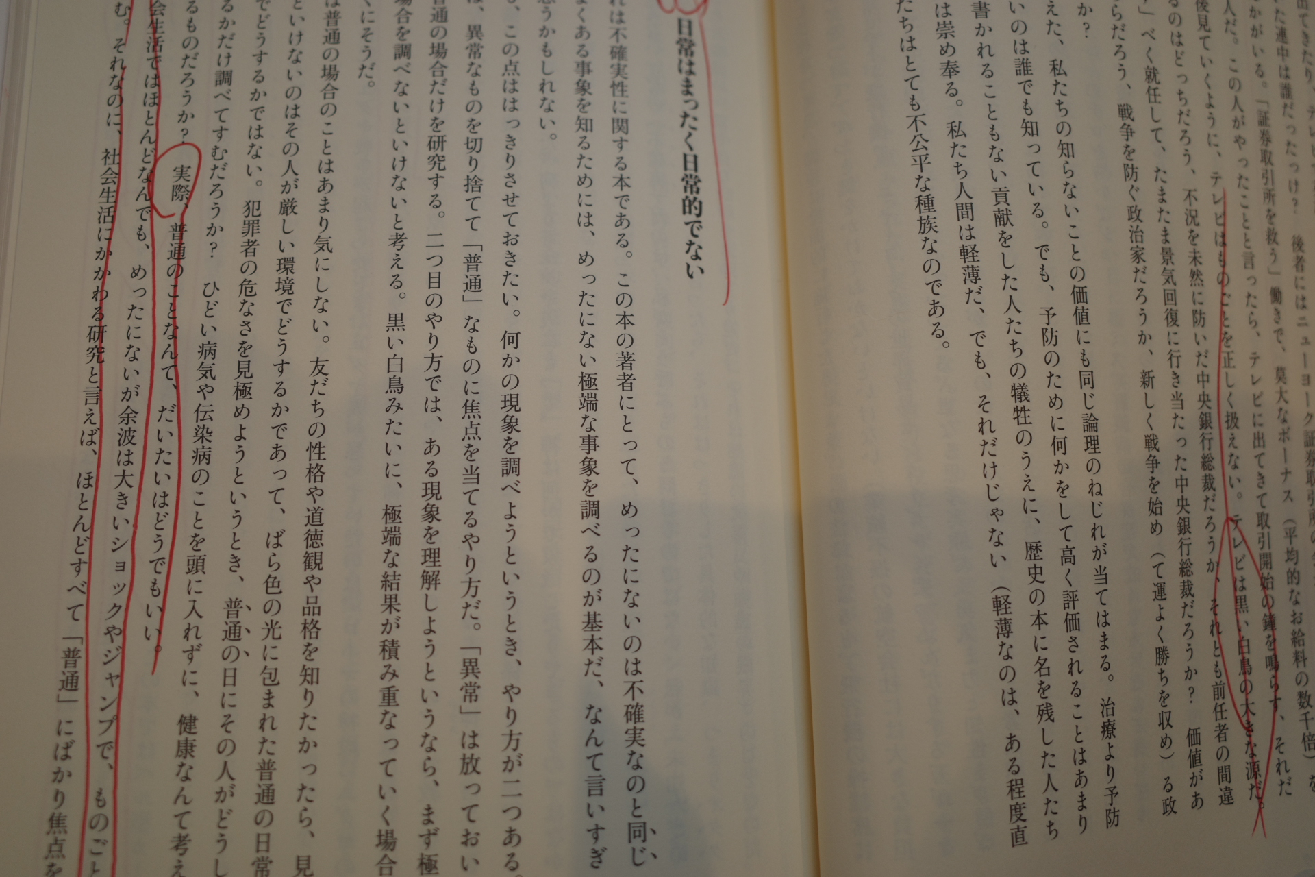 社会生活ではほとんどなんでも、めったにはないが余波は大きいショックやジャンプで、ものごとが進む。それなのに、社会生活にかかわる研究と言えば、ほとんどすべて「普通」にばかり焦点を当てている。「ベル型カーブ」を使って推論するやり方なんかはとくにそうで、あれではほとんど何もわからないのと同じだ。