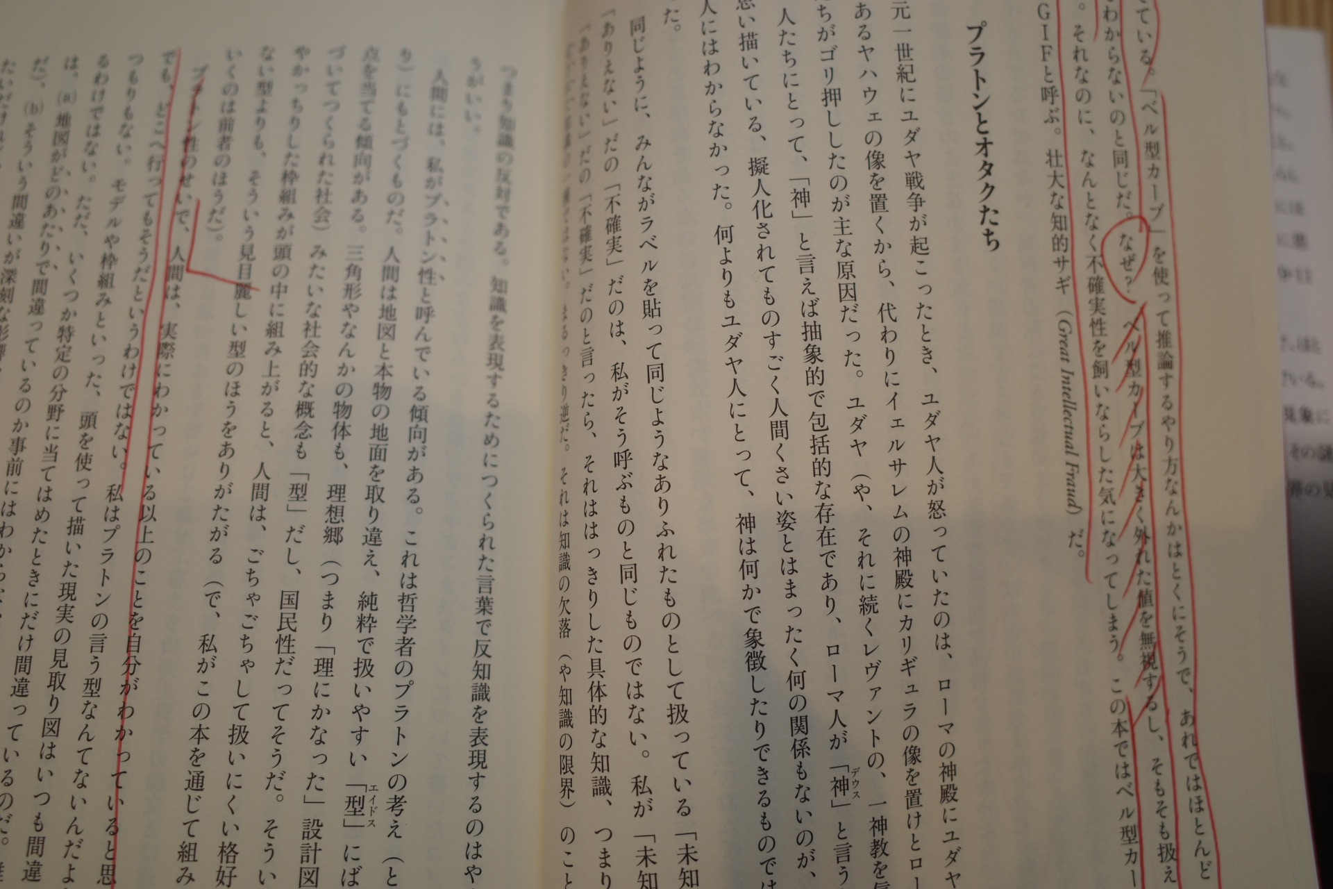 なぜ? ベル型カーブは大きく外れた値を無視するし、そもそも扱えない。それなのに、なんとなく不確実性を飼いならした気になってしまう。この本ではベル型カーブをGIFと呼ぶ。壮大な知的サギ(Great Intelletual Frand)だ。