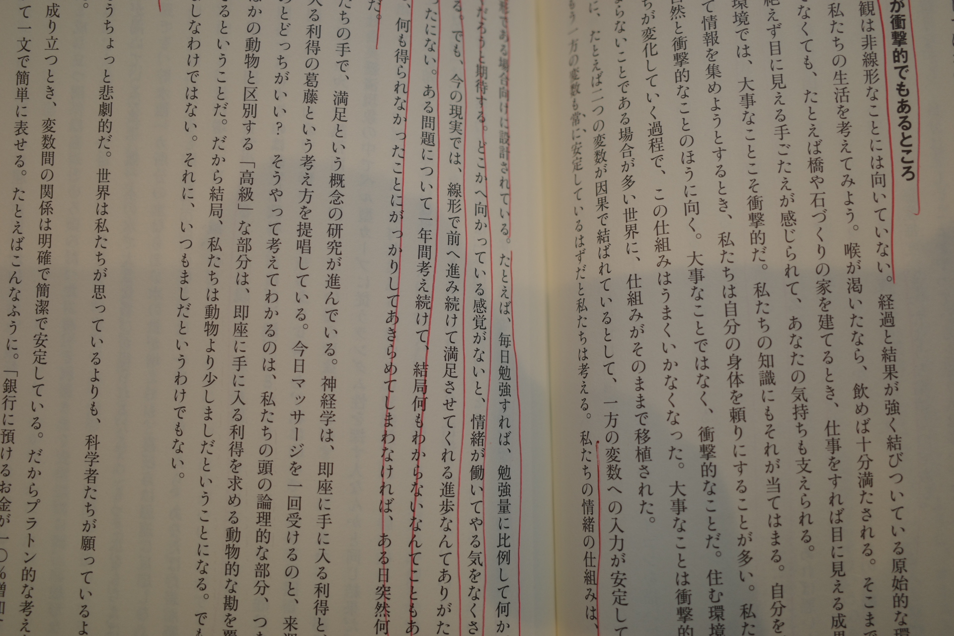 私たちの情緒の仕組みは、因果が線形である場合向けに設計されている。たとえば、毎日勉強すれば、勉強量に比例して何かが身につくだろうと期待する。どこかへ向かっている感覚がないと、情緒が働いてやる気をなくさせようとする。