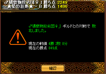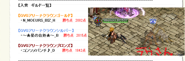 お久しぶりです!みきもろです。最近鏡ID作り始めました^0^武器姫なのですが、入り口・B1寄生だけでもう170になりましたw超楽やでぇ・・・220辺りになったらメインクエ始めようかなぁ~■GVそれでは、早速ですがたまりにたまった戦跡を!出てないGVもあるので、全てではないですが・・3月5日 VS☆SAKURA☆3月6日 VSえろり~な3月7日 VSスイス銀行3月13日 VSだけど必ず前を向く※転送直後鯖落ちして、点数表示されない状態になった為点数わかりません。3月14日 VS晴れたり曇ったり3月15日 VSぷぅあ~るてぃ3月18日 VSKNIGHT_MARE3月21日 VS負けたら脱ぎます3月23日 VSRed_Hot※途中抜けしたので、途中のSSのみです。以上です! イカさんもピエロちゃんも休止するらしい・・・どうなる在り処!それでは、また~