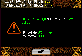 タイトル通りGV結果のみです!出てないGVもあるので全部ではないです・・・12月05日 VS虚空の迷宮様12月11日 VSKNIGHT_MARE様12月14日 VSトントン一家様12月16日 VS暁の討伐隊様12月20日 VS博麗神社の床下様12月22日 VS晴れたり曇ったり様確か10連勝だったのに全然SSがない・・・それでは、またね!