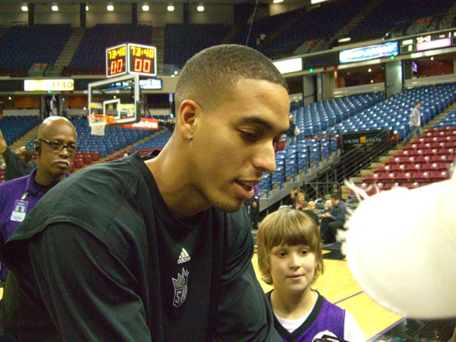 ケビン・マーチン選手 サインしてもらったチケット キングス対サンズの試合を見に4時半にアルコアリーナへ行った。試合開始は6時だが、今日はいい席を取っているのでコートサイドまで行って、試合前の練習をすぐ近くで見ることが出来る。そして運が良ければ、選手が来てくれてサインをもらえる。私はキングス側のサイドにいて、キングスの選手の練習を見てたが、シュート練習だけを見ていても、ほんとにプロだった。ノーマークのシュートはほとんど落とさない。練習の後で、ケビン・マーチン選手がサインをしてくれた。期待の若手だそうだ。 試合で応援しよう!