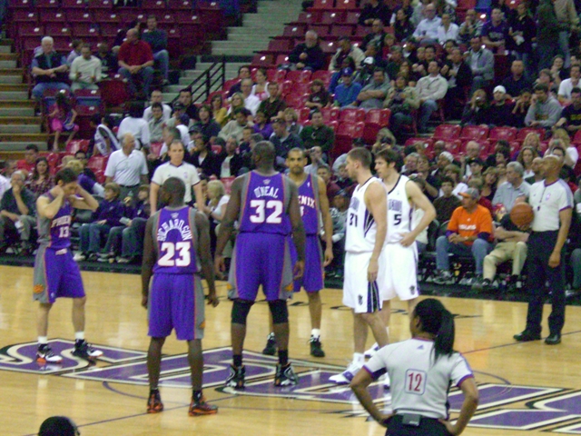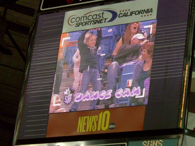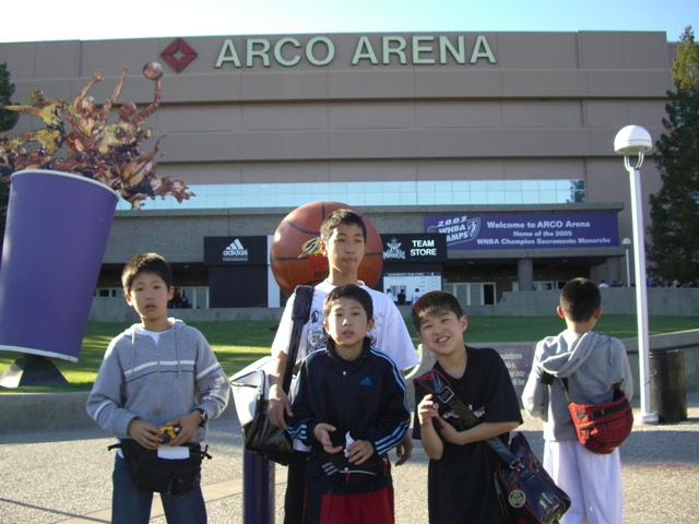 キングスの本拠地 「アルコアリーナ」 は空港から15分くらいの郊外にある。周りに高い高い建物が無いから、道路を走っていたら簡単に見つかる。金曜日の19時からの試合だというのに、駐車場に置いてある車の台数が明らかに少ない。今日はグリズリーズとの対戦で、どちらのチームも弱く、人気が無いということだな。私たちは2階席のそれも相当上の10ドルの席だったが、このアリーナはそんなに大きくなく、そこからでも選手は良く見えた。しかし試合の方が盛り上がらなく、見たい選手もいないので、ハーフタイムで会場を後にした。というのも、日曜日のサンズとの試合が140ドルという安い値段でベンチの後ろの席が予約できたからだ。