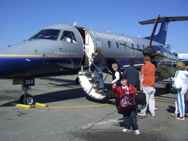 サクラメントからの飛行機 小さっ!最終日は、サクラメントからサンフランシスコへ移動し、そこから成田でまた伊丹へという強行軍だった。全部飛行機だが、その飛行時間は1時間・11時間・1時間とトータル13時間にもなる。さらに空港での待ち時間があるから、ほぼ1日になった。サクラメント・サンフランシスコ間は、30人乗りのプロペラ機で、案の定すごく小さい。車でも2時間くらいの距離だから、利用客も少ないのだろう。以前にもプロペラ機には乗ったことがあるが、すごく揺れる。飛行機に乗って怖いと思ったことはあまり無いが、これは怖いと思った。そして次に苦痛だけの11時間。少しでも楽にしようと、乗る寸前にジャージに着替えた。たいして効果があるとは思えなかったが、ズボンを履いているよりはいいのだろう。それに比べたら成田・伊丹の1時間ちょっとなんてあっという間だ。やっと大阪に帰ってきた。