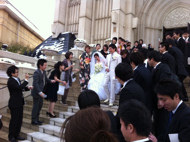 堺の最後の大会である卒業記念大会の日。朝から雪が降り積り、9時20分からの開始を1時間遅らせて対応した。うちの女子は1時からの試合だったが、1時間遅れたことで私には都合が良くなった。というのも3時半から結婚式が入っていて、もし1回戦に勝つと17時半からの2回戦にはまったく間に合わなくなるところだった。1回戦のEのきさんとの試合も4Qrを見ることなく結婚式場へ向かったが、点差が開いていたので、まぁ負けることは無いだろうと思っていた。そして早めに結婚式場へ着いたのはいいが、私は最初から挙式には出ずに披露宴から出席すると伝えてあった。ところが係の人が気を利かせて挙式の会場に案内しようとする。私は遅れて来たと思われるのが嫌なので、外で待っていますと言うのに、何としても私を中へ連れて行こうとする。私は待ってますと言っているのにお構いなしに前の方の空いている席に連れて行かれたので後からやっぱりみんなに遅れて来ましたねと言われてしまった。だからいいと言っているのにお節介なんだよ!ということで挙式に最後だけ加わり、披露宴となった。久しぶりに結婚式に出たけど、最近の結婚式はいろいろ凝っているのね。まぁ面白かったから長くても退屈しなかったけど、これを用意する人は大変だろうな。新郎も新婦も私の前の会社の後輩だから、招待された人も元の会社の人たちがたくさん。お袋さんを初めて見たけど、そっくりじゃん。最後の新婦からのご挨拶には、私も思わず泣いてしまった。楽しい結婚式をありがとう。 お幸せにね!そして急いで体育館に戻ってみると、すでに2Qrが始まっていた。その時のスコアが26対0。もちろん0点がうちで、相手のY野さんが26点。相手のプレッシャーにすでにビビっている。そこから少しは点を入れたが、10点取るのがやっとのところ。相手に50点は取られた。また不完全燃焼のまま女子の卒業記念大会が終わってしまった。6年生は来週にほんとの最後となる南大阪のグラデュエーションがある。最後は思いっきりはじけて欲しいな。