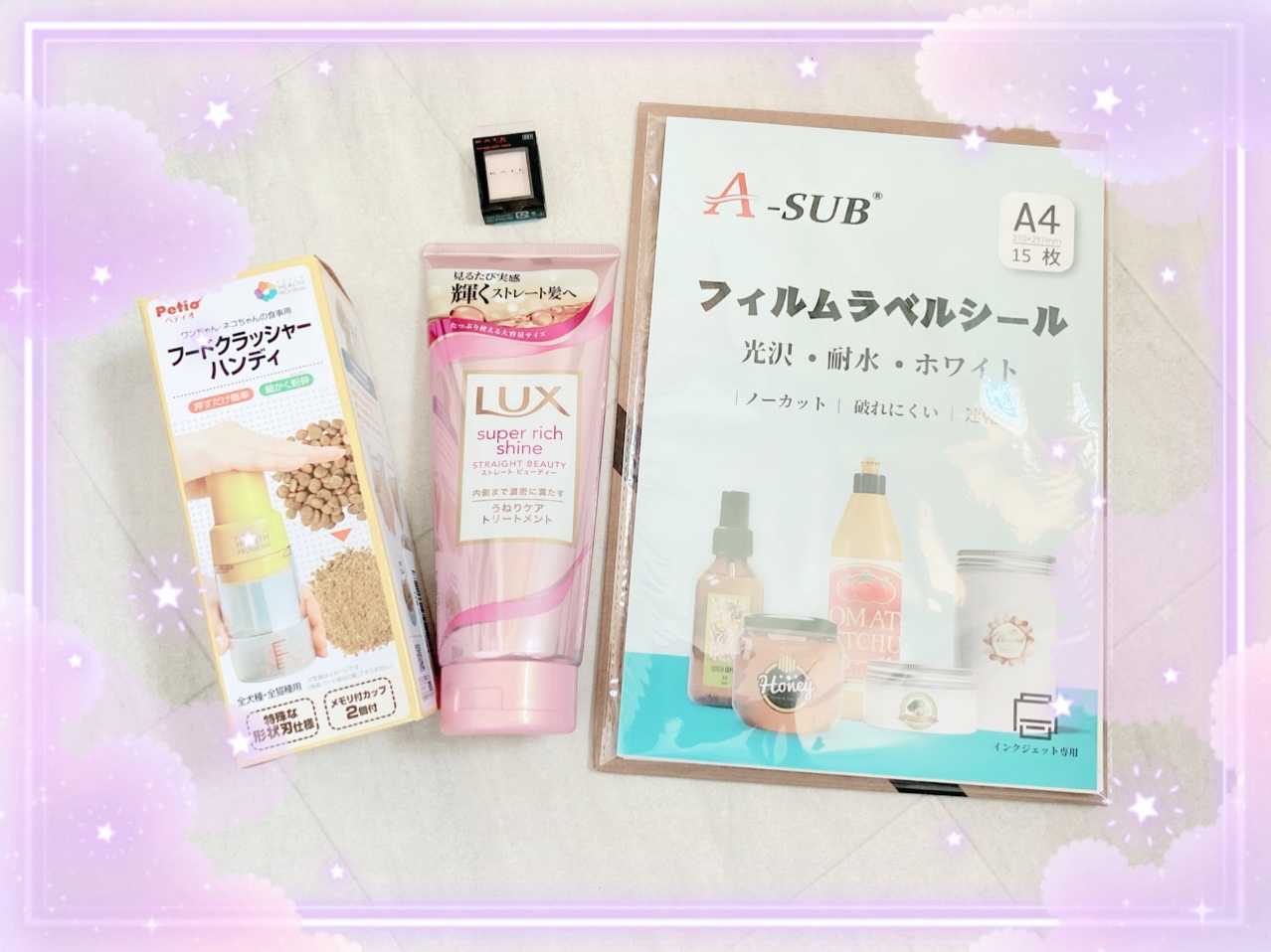 Amazon購入品ですが楽天のリンクを添えて ご紹介したいと思います😉 ※文字のみのリンクがAmazonです※ まず…写してないですがMilkLatteのフード ウェルネス ドッグフード 高齢犬用(7歳以上) コア(穀物不使用・高たんぱく質) 骨抜き七面鳥 1.8kg 高齢犬用を買ってみたんです ウェルネス コア 穀物不使用 高齢犬用 1.8g ドッグフード プレミアム価格:3916円(税込、送料別) (2021/7/20時点) 2匹共に肥えてきたのと😅 ミルクが10月で7歳になるのですが 運動量が少ないので今のフードが既に エネルギー過多かも?と思って ひとまず体重管理用にしようと思っていたら グルコサミンとコンドロイチンが入っておらず💬 MilkLatte共にヘルニア持ちでラテはパテラもあるので この2種は外したくなく💬 ラテが意外と繊細でサプリメントでも下痢するから 別で探すのは大変だなと 高たんぱくの良質フードなので エネルギー不足を気をつければ大丈夫そうだから シニア用にしよう!と思い立ったけれども 粒が分厚いんです😭 成犬用👇 2匹とも肥えては来たけど超小型犬なので← ちょっとこの厚みはしんどいだろうと (ラテは丸飲みが多いから危ないし) フードカッターを買ってみました ペティオ (Petio) ヘルス プログラム フードクラッシャー ハンディ ペット用 ペティオ ヘルス プログラム フードクラッシャー ハンディ(1コ入)【d_petio】【d_catgoods】【d_doggoods】【ペティオ(Petio)】[爽快ペットストア]価格:1289円(税込、送料別) (2021/7/20時点) ヒットしない物もあれば粉々になっちゃう物もありで なかなかシックリくる使い心地ではないものの 何とか使っております😅 ミルクは口内環境が悪いのに噛んで食べるコ😚 良い事なのでできる限り続けさせてあげたいです 𓐄 𓐄 𓐄 𓐄 𓐄 𓐄 𓐄 𓐄 𓐄 𓐄 𓐄 𓐄 𓐄 𓐄 𓐄 𓐄 𓐄 𓐄 洗剤やシャンプー類にスプレーなど ボトル類を見直そうと思っている今日この頃 きっと100均とかが多くなるから😅 以降の買い替えがしやすいように ラベルを自作しようと思います A-SUB ラベルシール 耐水 光沢 インクジェットフィルムラベル 15枚 A4ノーカット きれいにはがせる 手作りステッカー ホワイト 699円 A-SUB ラベルシール 耐水 光沢 インクジェットフィルムラベル 15枚 A4ノーカット きれいにはがせる 手作りステッカー ホワイト価格:1909円(税込、送料別) (2021/7/20時点) Amazonでまとめ買いセールをしていたので 気になったトリートメントも購入 LUX(ラックス) スーパーリッチシャイン ストレートビューティー 洗い流すトリートメント 本体 300g 定期便に入れて675円くらいで買えました ユニリーバ LUX ラックス スーパーリッチシャイン ストレートビューティー うねりケアトリートメント (300g) ヘアマスク 洗い流すトリートメント価格:1028円(税込、送料別) (2021/7/20時点) 早速使いましたが「うねりケア」効きます👍 これなら好きなシャンプーとコンディショナー使って このトリートメントでバッチリですね 良い物に出会えました🥰 一緒にクレベリンも買い置き クレベリン トイレの消臭除菌剤 消臭剤 芳香剤 置き型 ミントの香り [1個入] アース製薬 クレベリン トイレの消臭除菌剤 ミントの香り (100g) トイレ用 除菌 消臭価格:799円(税込、送料別) (2021/7/20時点) 𓐄 𓐄 𓐄 𓐄 𓐄 𓐄 𓐄 𓐄 𓐄 𓐄 𓐄 𓐄 𓐄 𓐄 𓐄 𓐄 𓐄 𓐄 下まぶた用にアイカラーベースを買ってみました ケイト ザ アイカラーベース 001 アイシャドウベース ルナソルのアイリッドベース気に入っていますが 下まぶたにはちょっと違うんです(好みの問題) 【ポイント10倍 7月20日】ケイト ザ アイカラーベース 001 目元用化粧下地 本体 1g アイシャドウベース アットコスメ 国内正規品価格:715円(税込、送料別) (2021/7/20時点) 好みの感じで乾燥せず良かったです😉 「おしろいミルク」がすぐに欲しくての買い物でしたが エリクシール ルフレ バランシング おしろいミルク C SPF50+ ・ PA++++ 乳液 35g 【ポイント10倍 7月20日】エリクシール エリクシール ルフレ バランシング おしろいミルク C 1 乳液 アットコスメ 国内正規品価格:1980円(税込、送料別) (2021/7/20時点) うーん…期待しすぎたかもしれない😂 ファンデとの相性もあるのでまだ断言は避けます スキンケアの仕上げ用にパウダーを やっぱりネットタイプの方が使いやすい! そして大きいので自宅用としては最適👍 ihana(イハナ) WHITE スキンケアVCスノーパウダー(大容量) ふんわり柚子の香り 透明 20g 1480円 【ポイント10倍 7月20日】ihana ihana WHITE スキンケアVCスノーパウダー 本体(大容量タイプ) 20g フェイスパウダー アットコスメ 国内正規品価格:2970円(税込、送料別) (2021/7/20時点) あとはヴィセの単色アイシャドウ ヴィセ アヴァン シングルアイカラー RED BRICK 023 1g 赤が欲しくてADDICTIONと迷って似た色にしたけど もう少し赤寄りが良かったのと 粉落ちするっぽい😭お蔵入りかな💔 【ポイント15倍 7月20日】ヴィセ ヴィセ アヴァン シングルアイカラー 【023】RED BRICK 1g アイシャドウ アットコスメ 国内正規品 _BM価格:880円(