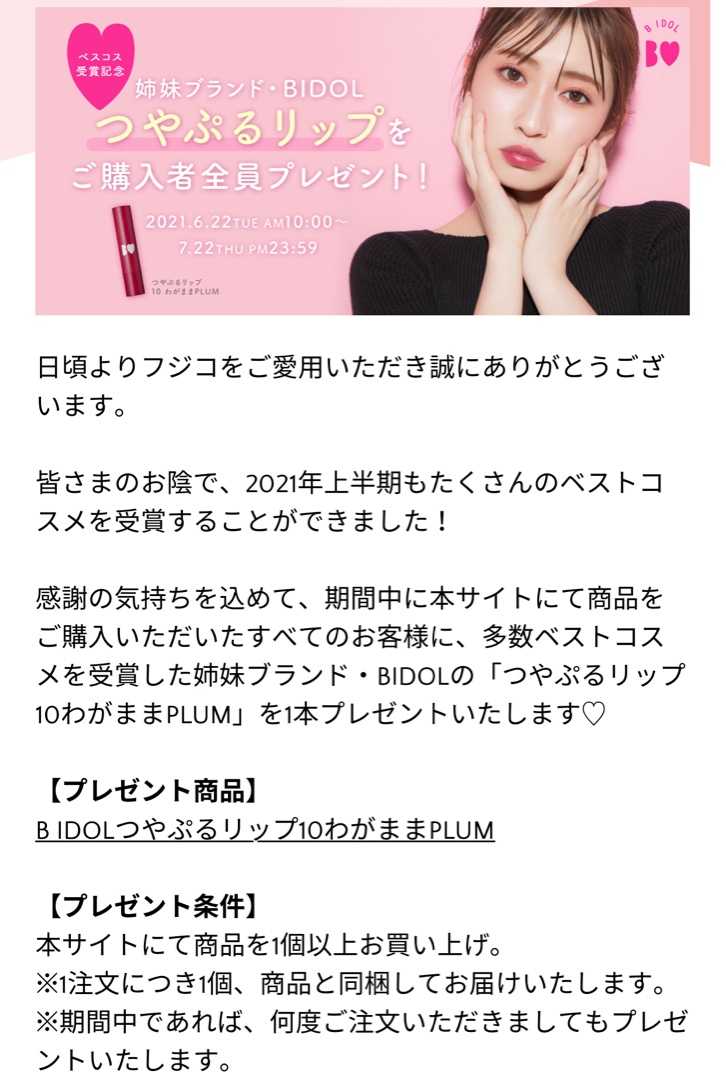 Fujikoオンラインショップ本店にて22日まで プレゼントキャンペーンをしておりまして 初購入してみました 発売されたばかりのドットライナー 悩んだ末に無限ブラウンを選びました [新商品]【Fujiko公式】フジコ仕込みアイライナー ドットライナー カラーライナー リキッドアイライナー ウォータープルーフ スマッジプルーフ フジコ価格:1628円(税込、送料別) (2021/7/19時点) 早速使ったので後ほど🖌 売れまくってるらしいティントリップ 3色とも“珊瑚”なので悩んだけど サンプル画像では良さそうだったから 珊瑚ピンクをチョイス 【Fujiko公式】フジコニュアンスラップティント ティント リップティント リップグロス リップメイク ルージュ ウォーターティント マスクにつかない フジコ価格:1408円(税込、送料別) (2021/7/19時点) これも使ったので後ほど… 08を買おうと思って商品ページに飛び 71を買ったリップ🤣 アスファルト! 【Fujiko公式】フジコミニウォータリールージュ リップメイク 口紅 リップベース カラーチェンジャー ミニコスメ価格:1210円(税込、送料別) (2021/7/19時点) 71はニュアンスを変えるカラーです そしてキャンペーンのプレゼント品 つやぷるリップの わがままPLUM 【ポイント10倍 7月20日】BIDOL つやぷるリップ 10 わがままPLUM 本体/グレープフルーツ 2.4g 口紅・リップグロス アットコスメ 国内正規品価格:1540円(税込、送料別) (2021/7/19時点) ドロドロに溶けて使えない!ってレビューが多く 今まで避けてきました 姉妹ブランド本家から送られてくるなら 大丈夫だろうと思ってゲット😅 色的にも使えそうだし楽しみです🎶 プレゼントキャンペーンは本家サイトのみ💫 22日で終了なので是非😉 https://fujikobrand.com/