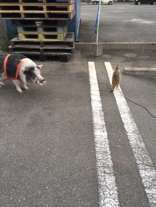 ブタ友の、ののかめさん(お隣の県に住んでいます)が遊びに来てくれました。ミニブタの嵐君(♂、6才)の飼い主さんです。6年ぶりに再会しました。残念ながら嵐君には会うことができませんでしたが、ミーアキャットのセブン君とエイト君を連れてきてくれました。初めて本物のミーアキャットを見ました。(私が)ふれあいました♪(興奮!!)この立ち姿はミーアキャット!!↓蓋にたまった砂を掘ってます。面白い。見ていて飽きません。↓いつか嵐君にも会いたいわ。また遊びに来てね!