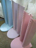 久々の更新です。というのも、とってもいい物を見つけたのでどうしても紹介したくってあまりにも長い間更新していなかったから何人の人に伝わるのかわからないけれど実は、ブーツを買ったのはいいのですが玄関にくた~っとほったらかしにしていたのでブーツスタンドを探していました。できれば、ブーツを逆さまに立てるタイプで。なぜかというと、足首のところにシワがよったりつま先部分にほこりがたまったりするのが嫌なので靴底が上を向くので、玄関の見栄えは悪くなってしまいますけどね。いつも使っている楽天でこんなステキな物があったとは・・・超おすすめブーツスタンド色がとってもきれいなの画像よりも少し濃い色合いです。スカイブルー・ラベンダー・パステルピンクを購入。玄関がぱっと明るくなりました。仕上がりもすべすべでとってもきれい。箱を開けたとき、思わずすりすりしちゃいました。プラスチックっぽく見えるけど、実はこれ木製、しかも日本製です。中国製・プラスチック製でも1200円くらいするものがあるのにこれはなんと、1個980円送料はかかってしまうけど友人と一緒に買えば節約できるし、6本セットだとさらにお得だね。6本セットは色も選べます。私は3足ブーツがあったので、1人で3個買いましたけど。丈夫そうだし、組み立ても1分かからないし、きれいだしとにかくおすすめです。ニーハイのブーツなら1480円のH520タイプがいいですが普通のロングブーツなら980円のH440タイプで十分ですよ。いろんな色が揃っています。好きな色が選べるよ 6本セットブーツスタンド6本セット(H440タイプ)このショップさんは、ブーツスタンドしか扱っていません木工一筋の製造会社なんだって。明伸shop