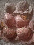 購入・到着は随分前なのですが、せっかく写真を撮ったので。でも見づらいですが・・・・備考欄にはベージュか淡い色がいいとリクエストしてみました。色は希望通りです。同じサイズのはずなのですが、微妙にカップの大きさが違うような・・・小さい順に上から並べています。小さめサイズのためか、3枚とも取り外し可能なパッド付きでした。また、3枚ともストラップ取り外し可でした。1番上のは白の2分の1カップです。フロント全体にラッセルレースを使用しています。レースは大きな5枚弁の花モチーフで若々しい印象です。アンダーはしっかりホールドします。ただ残念だったのは、着けるとバストトップが外をむいてしまうことです。真ん中のものは淡いピンクの4分の3カップです。カップはジャガード織りのローズ模様です。オレンジ色に見えるところはローズモチーフのレースが縫いつけられています。カップ上辺とストラップにはローズモチーフのケミカルレースが縫い付けられています。残念なのは、サイドからバストが逃げてしまうところです。1番下のは淡いオレンジの4分の3カップです。フロント前面とフリルはチュールレースでカップの上半分とカップ横にはローズモチーフの刺繍が施されています。カップ下とストラップには小花模様のラッセルレースが。リボンもあちらこちらにとめてあり、すっごくかわいいです。残念なのは、アンダー、サイドからバストが逃げること。また、カップ自体が横にべちょっと広がった形で小さい胸なのにブラで高さを出せないこと。おばちゃんっぽいのがきたらどうしようと心配していましたが3枚ともとってもかわいかったんです。でもでも、30代・出産経験済みの私にはもう少し補正力が欲しいです。おしゃれ着としては申し分ないのですが・・・下着にかわいさを求めていて、補正力は二の次という人にはとってもいいと思います。なんといっても安いですから!送料込み\1380