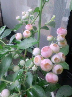 5月の末に植木市で買ってきたブルーベリー、最初から結構たくさん実が付いていたのですが、ずーっと青いままで変化がなく、生きてるのかしら?…と思うほどだったんですけど、2ヶ月以上たって、やっと色づいてきてましたー。そして一つだけもうかな~り熟してるっぽいのがあったので、嬉しくて早速洗って食べて見たところ…ス、スッパイ!!…そしてスッゴイまっずい!!うちのはラビットアイ系の「ティフブルー」という品種らしいのですがネットで調べると甘みが強くて美味しいって書いてあったのに…。スッパイだけじゃなくて、こんなに不味いなんて…なんかザラッとした舌触りでなんとも言えない味なんですよ…。しっかり何か管理して育てないとダメなのかもですねぇ~。ま、そんな簡単に美味しいのが食べられると思うなよってことですね一応これからももうちょっと完熟したものを食べてみますが、来年はもっと美味しいのがなるように、これからしっかり調べて頑張ってみますー
