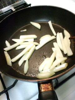 簡単に、味付けも考えずに作れてごはんもススむ美味しい炒め物です。ある人から教えてもらったものですがポン酢好きの我が家ではすっかり長年の定番になりました。まずジャガイモ、1cmぐらいの細切りにしてサラダ油で炒めます。あんまり動かさないで、焼き目をつけるようにしてジャガイモが透き通ってくる感じに火が通ってきたらくし型に切っておいた玉ねぎを投入。玉ねぎもちょっと透き通った感じになってきたら1cm幅ぐらいに切った赤ピーマンを投入。(↑赤ピーマンはなくても可。たまたま残ってたので入れてみた。基本を教わったときはジャガイモ、玉ねぎ、牛肉のみでした。)さっとまぜながら1分ぐらい火を通したら最後に牛肉切り落としを入れて、肉の色が変わるぐらいまで炒めます。私はお肉は柔らかいほうが好きなのでほんのり少しピンクが残ってるぐらいでポン酢を適当に3回しぐらい投入。(私はゆずぽんとノーマルのを合わせてます)器に盛ってゴマでもかけて出来上がり。今回は赤ピーマンが良い彩りになりました。ジャガイモもちょっと固めぐらいでも美味しいので時間もかからず、ささっと一品になります。玉ねぎとジャガイモはだいたい常備してあるし、お肉が少し残ってたりすればできるので、買い物いけなかった時とか、考えるのがメンドクサイ~っていうときに作ってます。これならお料理苦手という方も失敗無くおいしくできると思いますのでぜひちなみに、これを作ってるときの赤ピーマンの中の一つ、切ってみたら中に赤ちゃんが可愛かったのでパチリ卵が双子だったりする時とかさくらんぼがふたつくっついてたりする時とかなんか嬉しいのはなぜかしら