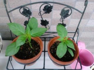 雑草説がささやかれていた、(←自分発信だけど…)我が家のトウガラシちゃんですがどんどん大きくなって二つとも同じように成長してきたので、もうトウガラシでほぼ間違いないかと思われます。だいぶ窮屈そうになってきたのでやっと植え替えしました。ちゃんと実がなってくれるかな~楽しみだな~そして…それに引きかえこちらのアスパラとバジルはとっても心配。(前の日記に書いたローソンでやったやつです。)水に漬けてから2週間がたちましたが…アスパラのほうは、か弱そうだけどちゃんと芽がでてきたのですが、バジルは未だにシーンとしたまま…。ちゃんと種入ってるのかな…?アスパラは発芽まで約15日とあったから順調なんだろうけどバジルは発芽まで1週間ぐらいって書いてあったのにな~。種っぽいものも見えないし心配…。う~ん。でももう少し様子をみてみようかな。雨ふって寒い日も結構多かったからね。もうちょっと信じてみよう!