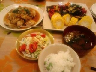 夏のお野菜、色とりどりで食欲をそそりますよねまえに蒸し野菜も大好きだと書きましたが、夏野菜は焼き野菜で食べるのも大好きな私。いろいろ買ってあったお野菜で野菜づくしの夕飯をつくってみました。ズッキーニ、人参、赤ピーマン、かぼちゃがあったので焼き網で焼いて、更にフライパンにオリーブオイルを入れて、野菜全部を入れてさっと焼いて軽く塩コショウで仕上げました。そのままも食べれるけど、この日はゴマダレポン酢をつくったのでそれにつけて食べました。とうもろこしは、蒸かしました。今年はとうもろこしの出来が良いみたいですね。もう4回買いましたが、安いのでもハズレがなく、甘くて美味しかったですメインは鶏肉のソテーに大根おろしとシソとポン酢をかけました。サラダはカニサラダ。キュウリとレタスとたまねぎとトマトが入ってます。ご飯は豆ごはん。時間ない時は、しお豆なるものを買っておくと混ぜるだけでできるので便利です。炊きたてのごはんにしお豆(えんどう豆)を投入して、お好みで少し塩を足したりして、ざっくり混ぜて出来上がり。あ~簡単。…だけども、売ってるやつは食品添加物も入っているので時間とやる気があるときは、健康のためにちゃんと自分で炊き込みしないとですね~