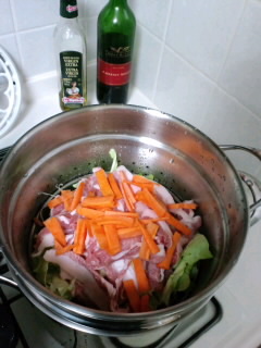 料理と言っていいのか…、蒸しただけで、キレイに飾ることもなく、そのまま出したものなので大変おこがましいですが、一応キャベツとか人参とか大根とかピーマンとかその日あった野菜をお好みの形に切って蒸し器に投入。豚バラ肉もあったので、野菜と一緒に投入。10分ぐらい(もっと早かったかな…?)蒸したら出来上がり…。ちなみにこの日のつけダレはお気に入りの玉ねぎドレッシング。玉ねぎ半分ぐらいをすりおろして、酢、醤油、サラダオイル(←お好みのオイルで)レモン汁少々酢と醤油は同量ぐらい、オイルは少なめにしてます。レモン汁の代わりにしょうが汁でもおいしいです。うちではこれを基本にしてバジルを入れてみたり大根おろしを足してみたり、ゴマダレをプラスしたりラー油とか辛味のものをいれてみたりして、気分によっていろいろアレンジして、しゃぶしゃぶのつけダレとかにもしたりします。淡白なお鍋のときは、つけダレがいろいろあると飽きずにいっぱいお野菜食べれるからおススメです☆ちなみに今回この蒸し野菜を盛ってるお皿は旦那が相撲を見に行ってきてお土産に貰ってきたお皿。旦那が持って帰って来た時は、「こんなの使わないよ~邪魔だよ~返してこいよ~」なんて、ボロクソに言ってたんですけど…、捨てるのも勿体無いし、ちょっと試しにカレーの時に使ってみたら、意外や意外…お皿の傾斜がちょうど良くて、なんか食べやすい…。なのでチャーハンとか、焼きうどん・焼きそばとか食べるときはこのお皿ばっかり使ってる私…。そしたら、最初私にボロクソに言われてたもんだから、旦那が「結構使ってんじゃん!」とツッこんできて、「やっぱり俺は良いもの持ってきたんだ~ 俺が~」…などと得意になって自分の手柄をアピールしてきてウザイから「物を大切にする私がエライんだよ!」…と言ってやりました。私は負けない!(↑……なんの報告?)