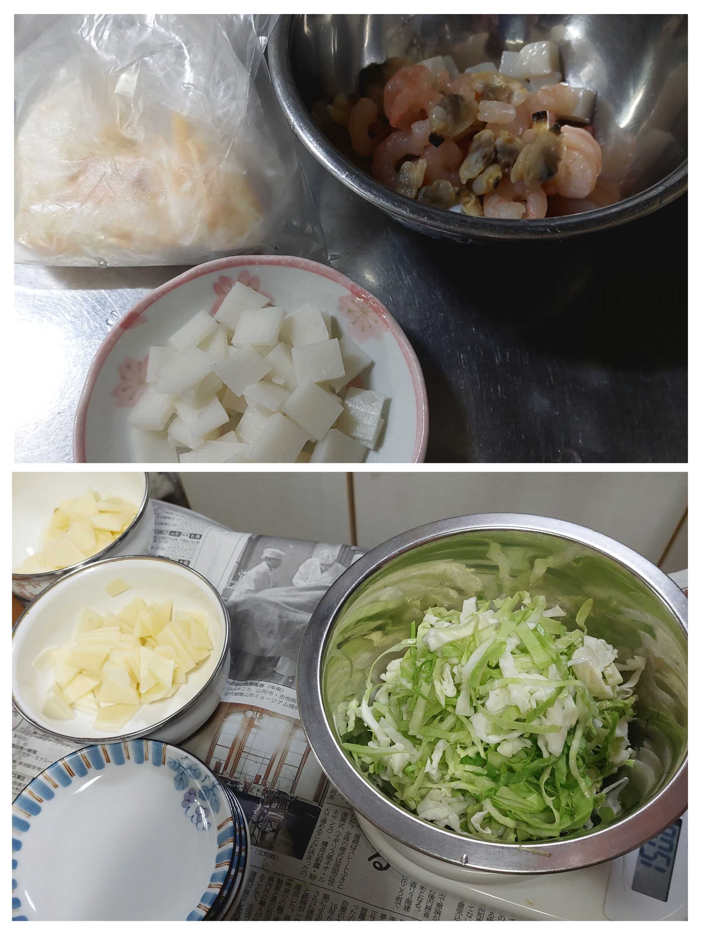 ●チーズ、餅、明太ばらこ、シーフード、キャベツ、じゃがいもを用意しました