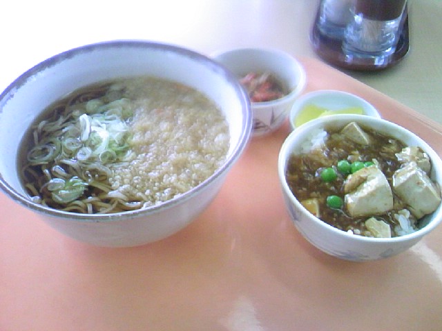 フツーはマズご飯とおかずなんですが、今回は、なぜにかかけそばと麻婆丼。