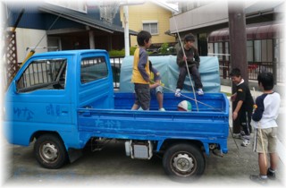 今日もチョット肌寒い1日でしたネッ!!おかげで、ファンヒーターに残った灯油を最後まで燃やし尽くし、片付けることが出来ました ( ̄▽ ̄)Vさて、そんな午後...ケンが帰宅すると、それに続いて4人のお友達が集まって来て、元気に外遊び (o^∇^o)ノ竹細工用にと、カーポートの屋根下に干してあった竹竿を取り出し駐車場の”青い軽トラ”に飛び乗ったり飛び降りたり...竹竿を振り回しての「チャンバラ」が始まりました w( ̄▽ ̄;)w元気に飛び回る姿は、さながら『孫悟空』♪♪「お~い!ケンゴクウさん!!」と声を掛けると『ウキィ~♪♪』と...なかなかイイのりでした (∩。∩;)ゞ最近は、チャンバラなんてしてる姿、見掛けませんネッ!!そして『秘密基地ごっこ』なども...秘密基地に出来るような環境が、少なくなったモンなぁ~ ( ̄へ ̄|||)我が家の”青い軽トラ”は、イイ「秘密基地」代わりにもなってるみたいで本当に、イイ遊び場になってます (*^^*)ありがとうございます☆★☆彡