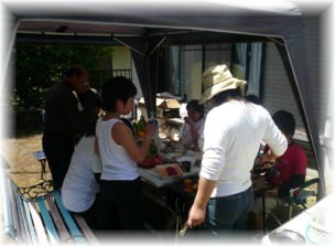 今日のメインイベントは『お庭でバーベキュー』(o^∇^o)ノ一番楽しみにしていたのはケンで昨日から、友達とも約束をしてルンルン♪♪ところが、朝起きてみると昨日から続いて、シトシトと雨が...ケンに「雨降ってるネ!!」と言うと『えぇ~っ!!どうするよぉ~★』と今にも泣き出しそうな顔...(/□≦、)天気予報を確認すると、何とか回復基調☆彡ということで、しばらく様子を見ることに (「・・)「回復が遅れたら、夕方からでもやるか!!」とケンの期待に応える気持ちでいると10時頃になって、かなり空が明るく♪♪『よし!!大丈夫だろうからやろう (* ̄0 ̄)/』決断したところから、ジージ・バーバに連絡したり子ども等も、他の友達に電話をかけたりパパとママは食材等の買出しに!!みんなの”ワクワク”が天にも通じたのか買い物から帰る頃には、朝とは打って変わって見事な快晴に ☆(*^o^)乂(^-^*)☆『決断すること』のパワーを感じちゃいました♪♪☆---☆---☆---☆---☆さぁ!!晴れたとなると日差しは夏並み...(^^;)炭火を起こしたり、テーブルを準備したり動き始めたら、もうスグに汗びっしょり!!とても青空を見ながらでは食事になりそうになくタープまで組み立てることに...イキナリ日焼けしちゃいましたがみんな快適に楽しい食事が出来たようでイッパイの笑顔に、私もとっても幸せ気分 (*^▽^*)とっても、とってもステキな時間となりました♪♪子ども達も、仲良く話をしたりときには肉を取り合ってケンカしたりととっても微笑ましい (*^^*)日頃は2人きりで食事をしているジージ・バーバも『こんなたくさんで食べるなんて、久しぶり♪」とご満悦の様子☆彡みんな、また近いうちに集まって楽しもうネェ~♪♪ありがとうございます☆★☆彡