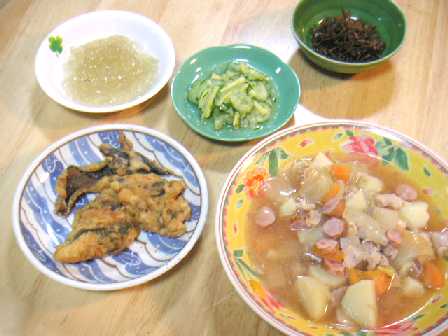 今日は、晩飯をつくる。左下は、さわらのワカメ入り衣で揚げたもの左上は、メカブのトコロテンに梅しそ風味あえ左下はポトフーあと、きゅうりの梅ドレッシングに生姜あえといかなごです。身体に優しい料理を作って母と姉と私と女三人で食べました。お父さんが家にいないと、なんだか寂しい。