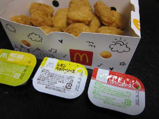 すごく久しぶりにマックチキンナゲットを買いました15ピース390円。限定ソースのレモンペッパーとトマト&ハラペーニョを選びました爽やかな酸味が利いていてレモンペッパーうまーい夫はハラペーニョの方が好きと言っていたniaはキッチンの出入り口付近でゴロンとなったまま動きません。ひじょうに邪魔です