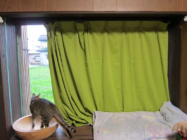 今日はのんびり、ぐうたら過ごしてやるぜと思っていたがもうすぐ購入したエアコンの取り付け予定日なのでかねてから考えていた猫用ドアの製作に取り掛かってみたとは言っても使っていない障子の桟をノコギリで切りタッカーで布を貼るだけ一番下の布だけ固定していないのでここからniaが出入りします裏側はマジックテープをつけましたこんなん作っているうちに雨は上がっていましたniaは昼寝していたみたいだね