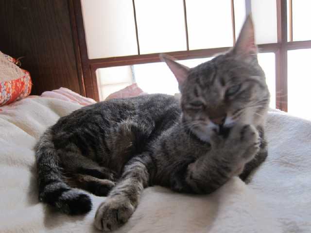 niaは自室で爪のお手入れ中niaは猫だけどいっちょまえに部屋を持っているのよ古い家だけど夫婦2人なのに7部屋もあるからねいつもならカメラを向けると嫌がるのに爪のお手入れに夢中でそれどころじゃないらしい玄関に一番近いniaの部屋には今月、新しいエアコンが設置されたので益々快適になりました2階で寝るのが暑苦しくなったら(私の寝室は2階なのです)私もniaの部屋で寝る予定です夏の間だけお邪魔しますね。niaどうぞだにゃん