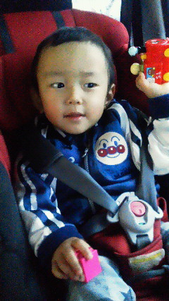 運転席のヘッドレストに映るアンパンマンに夢中です