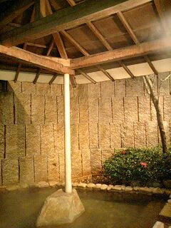 露天風呂は東屋風のつくりになっていて、目の前の巨大な石の壁にちょっとビックリですが、昼間の方が壁から流れ落ちる水がキラキラ光って、風情があるのかなぁって思いました