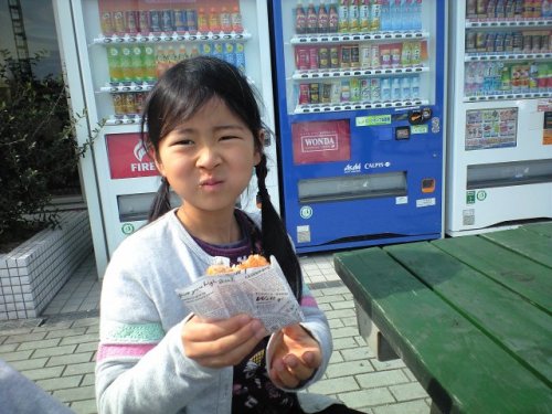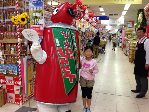 買い物に行ったら アースジェット が居ました。じゃんけんで勝った商品を貰って記念撮影 「さしばし」 でした!!