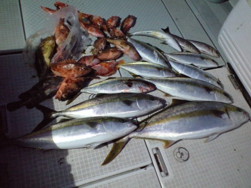 お父さんが魚つりに行きました。一緒に行った人たちは沢山釣れたようですけど、お父さんは3匹だけ おじちゃんといとこも呼んで刺身飲み会でした。 「アラカブ刺身の炙り ポン酢醤油 ネギと紅葉おろしを添えて」の出来上がり!!
